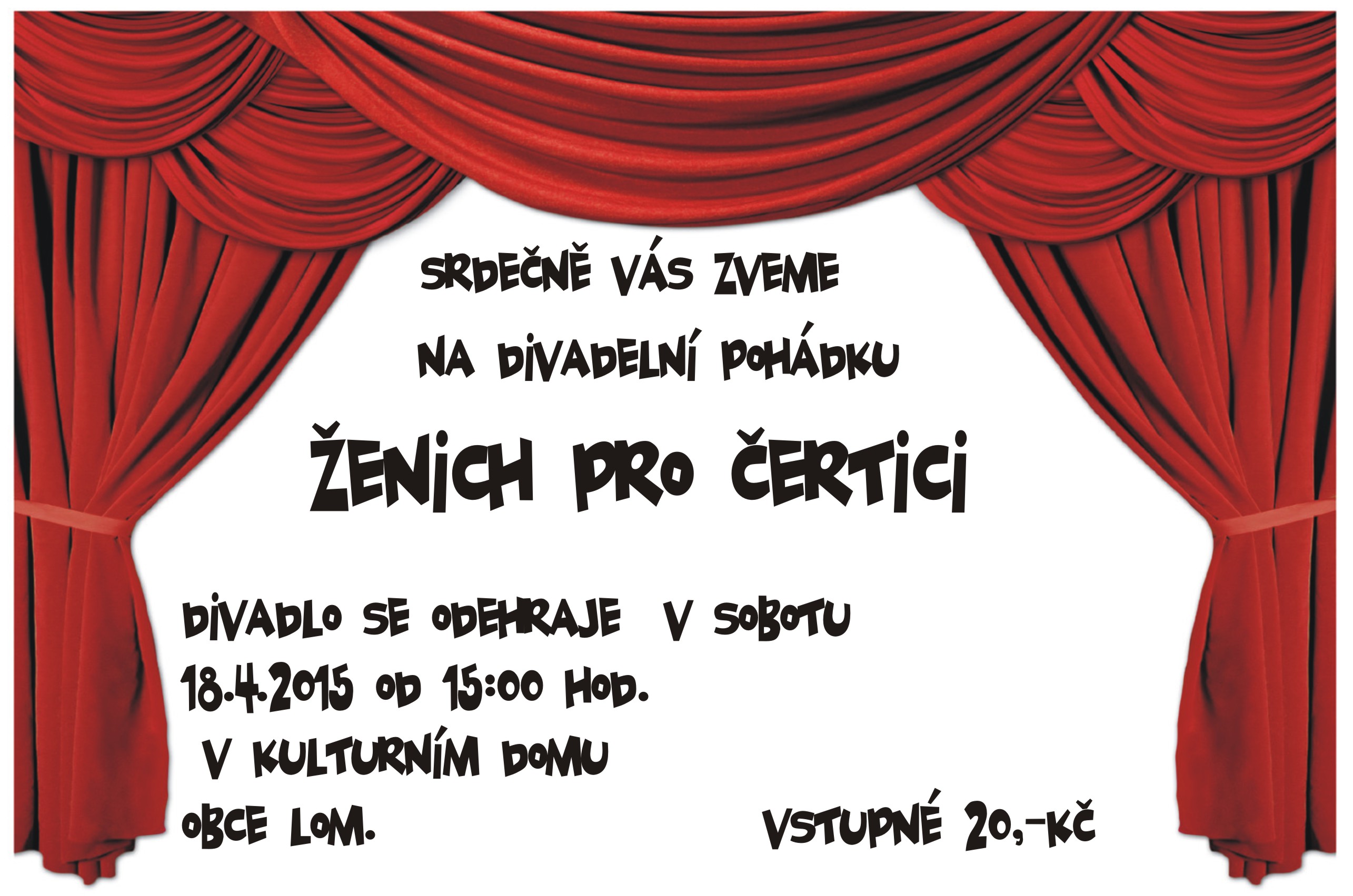 Zveme Vás na divadelní pohádku "Ženich pro čertici" představení se odehraje v sobotu 18.4.2015 od 15:00 hod.
